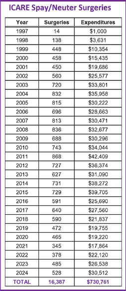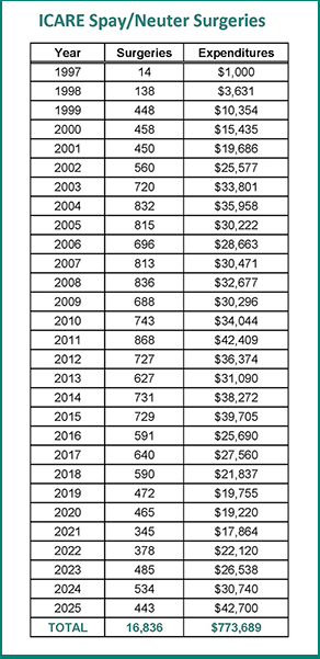 ♥ In the past 27 years, ICARE has spent $730,000 on over 16,000 spay/neuter surgeries for cats and dogs in need. All from donations - ICARE receives no government funding and has no paid employees. This has prevented the birth of thousands of unwanted kittens and puppies. Consequently, Inyo County Shelter impounds (strays and owner turn-ins) have decreased 45% (1,164 in 1995 to 632 in 2024).